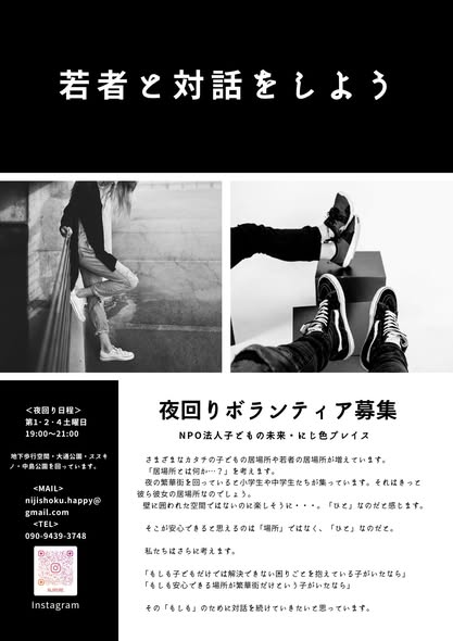 今月は4月の新年度に向けて「Night watch夜回り」と「ナイトスペース〜若者の居場所〜」についてです。